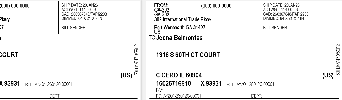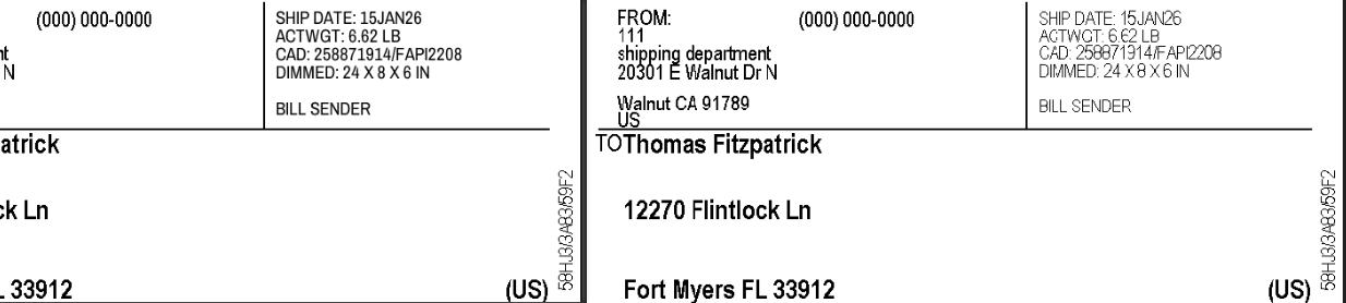 其中CAD为FedEx账号对应的固定数值,以上信息统一自画展示 使用统一字体,要求面单右上角信息字体风格一致,整体协调。