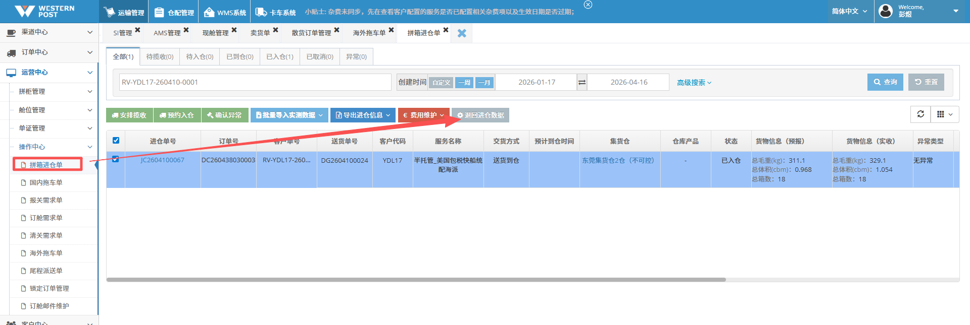 第一步:【运营中心】-【操作中心】-【拼箱进仓单】-【退回进仓数据】,等15分钟代理系统自动同步重量到TMS