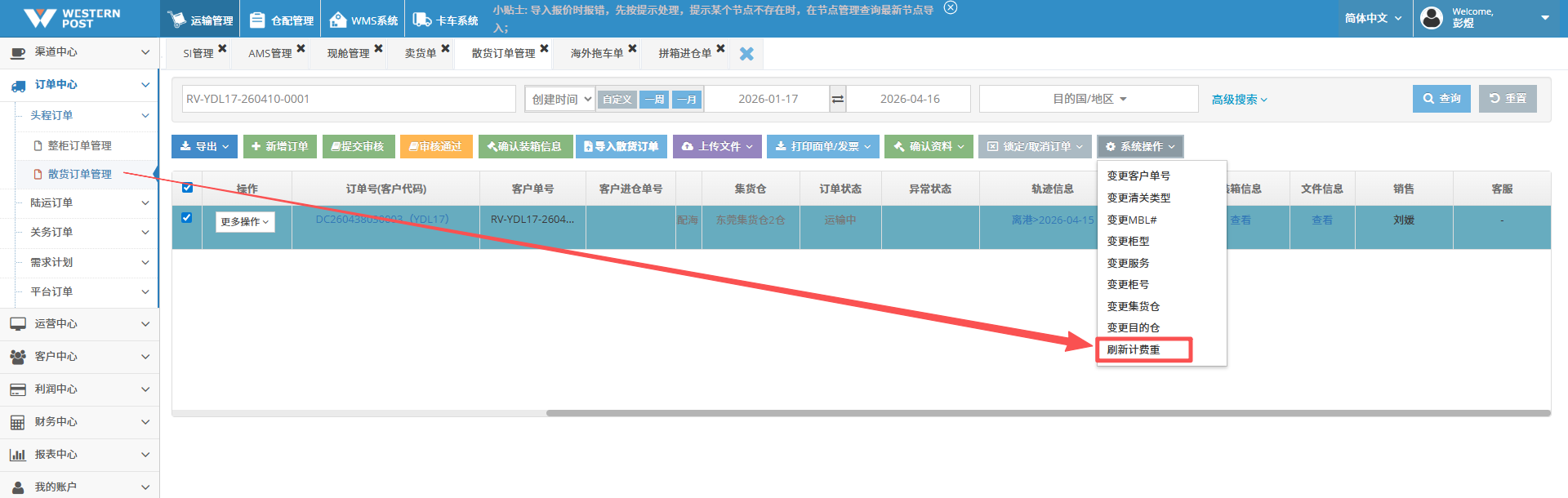 第二步:【订单管理】-【头程订单】-【刷新计费重】