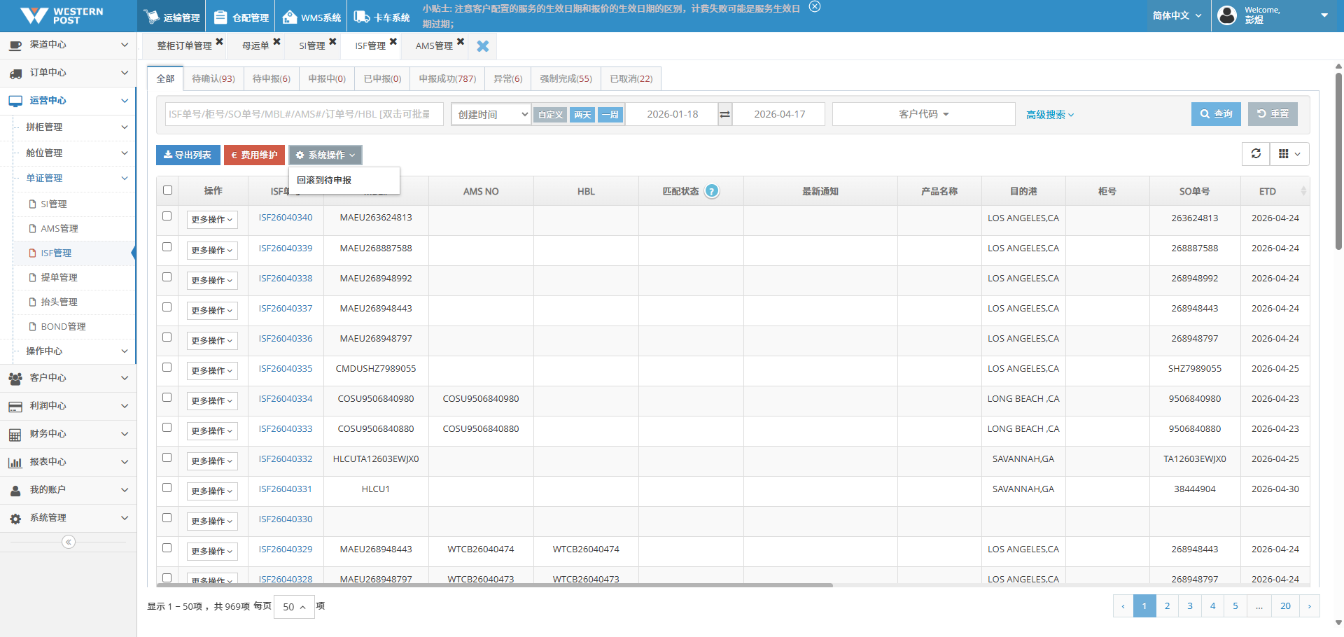 系统操作位置:【运营中心】-【AMS管理】-【回滚到待申报】