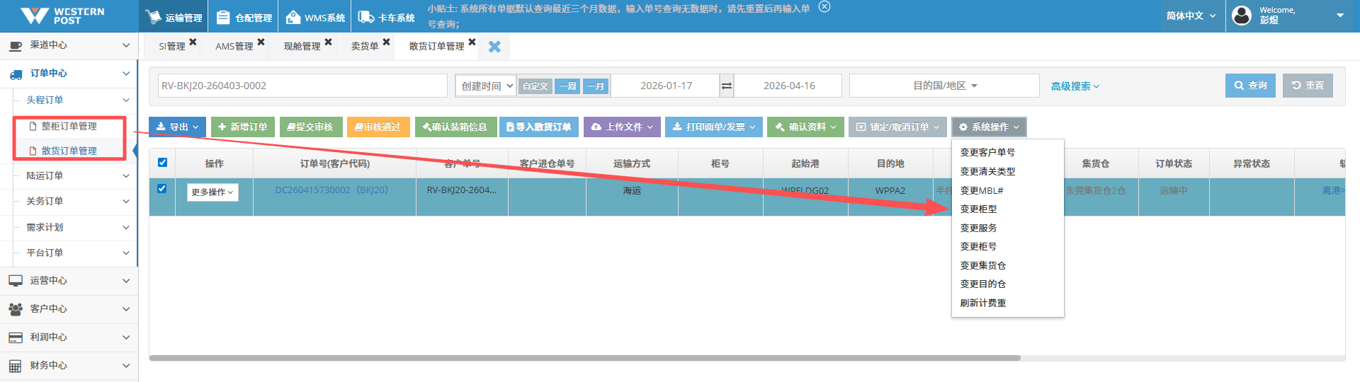 系统操作位置:【订单中心】-【头程订单】-【系统操作】-【变更服务】