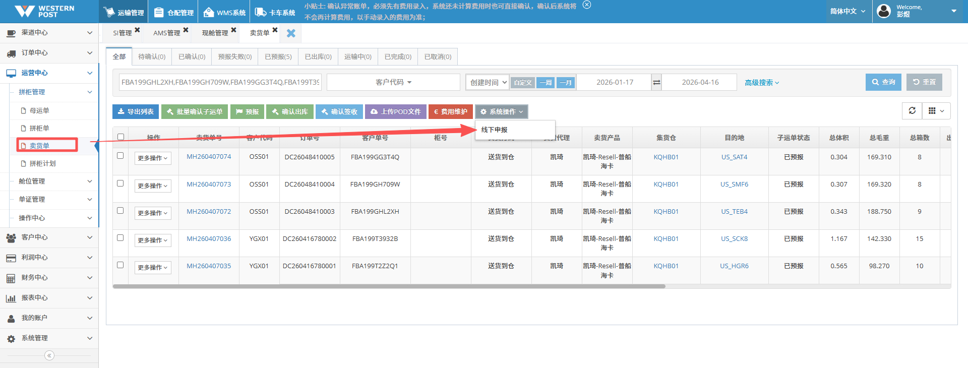 系统操作位置:【运营中心】-【拼柜管理】-【卖货单】-【线下申报】